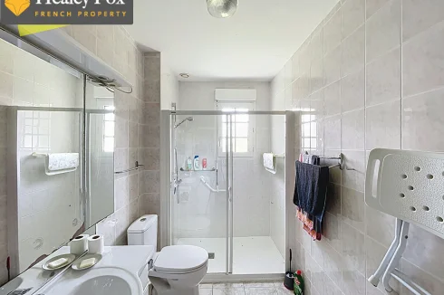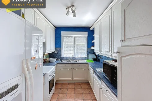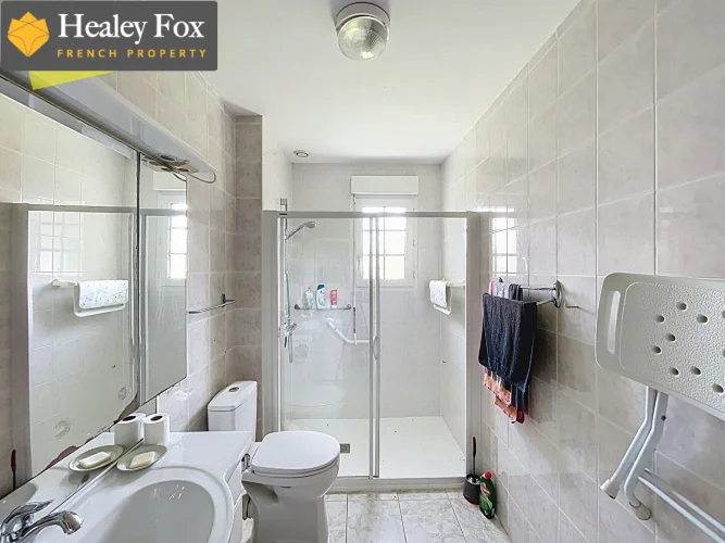It comprises an entrance hall with built-in wardrobes, a bright living room with an insert fireplace, a fitted kitchen, three bedrooms all equipped with a sink, a shower room, and a separate toilet.