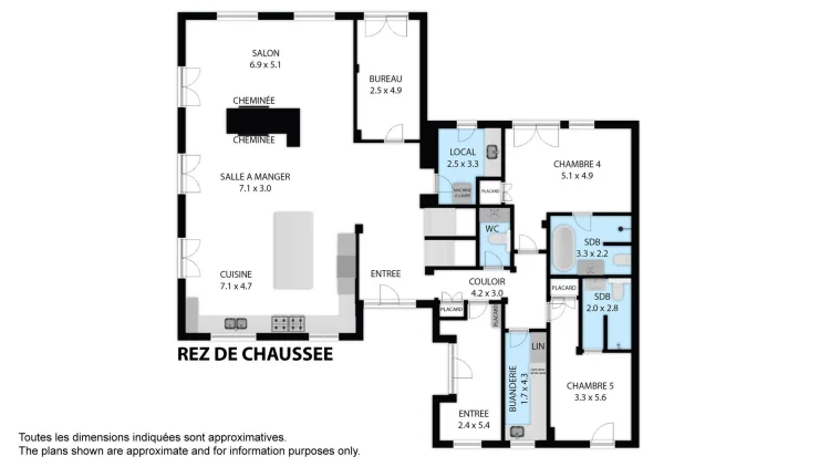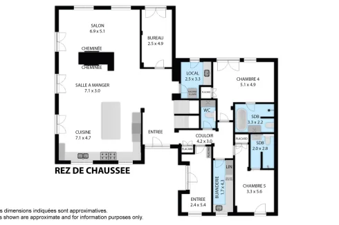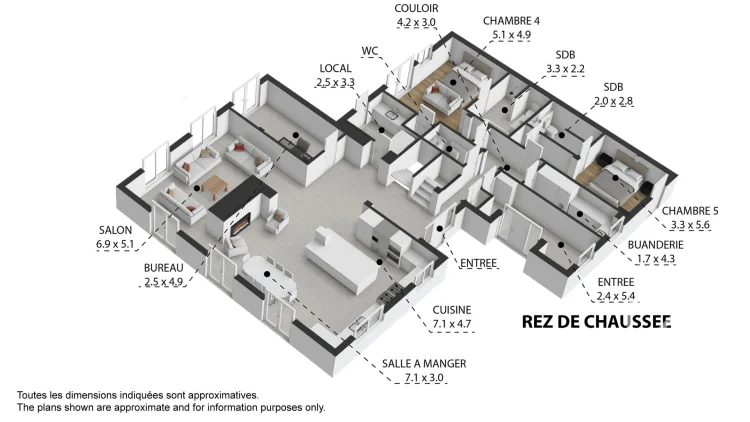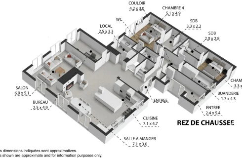 **Exterior:** 19 200m2 of protected private land, high ceilinged 74m2 garage, mazot, wraparound flagstone terrace with outdoor dining area, long private driveway, ample parking.