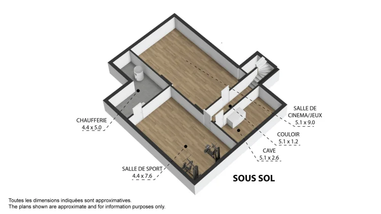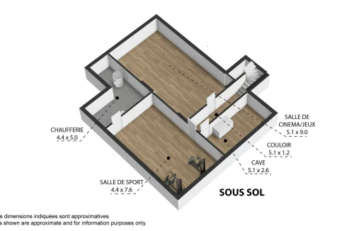 **Lower Ground Floor:** Gym, technical room, storage room with potential for conversion into a home spa, plus a generous cinema/games room