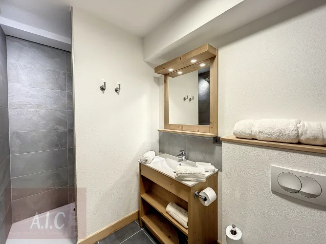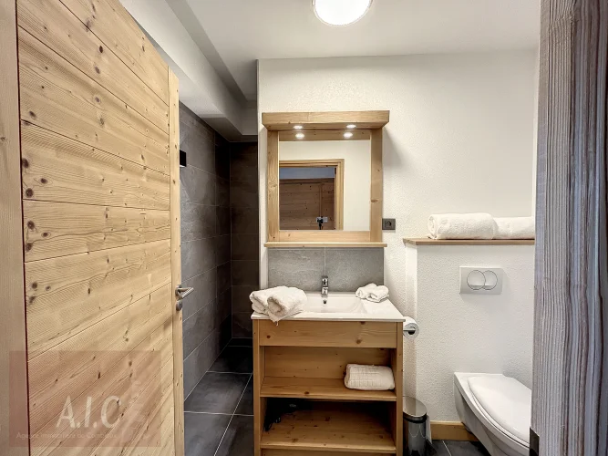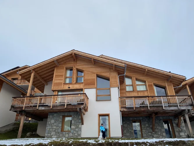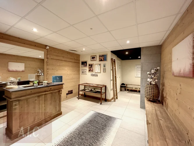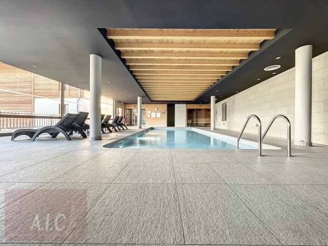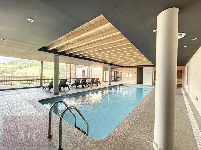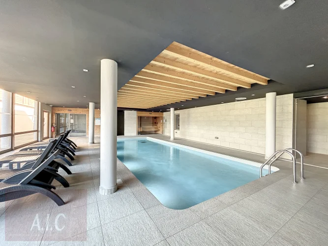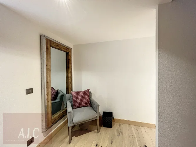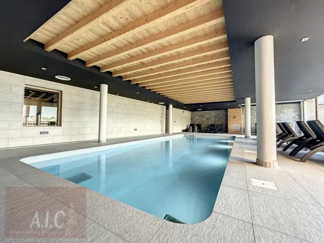Residents enjoy access to the chalet’s exclusive swimming pool, a serene relaxation and wellness area, as well as two indoor parking spaces, and a dedicated ski room for winter sports enthusiasts.
