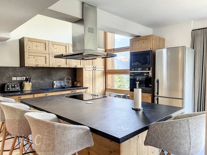 Enter through a welcoming foyer into an expansive living area, thoughtfully designed to maximize natural light and views. This level includes a spacious dining room, an inviting living room, and a cozy lounge, all opening onto a beautifully landscaped terrace with an uninterrupted vista of the Mont Blanc Massif. The open-plan, fully-equipped kitchen with an adjacent dining area offers an ideal space for both entertaining and casual family gatherings.