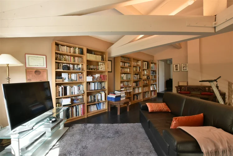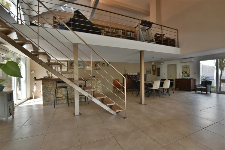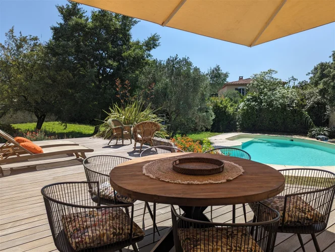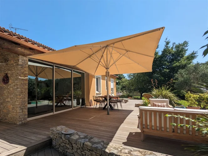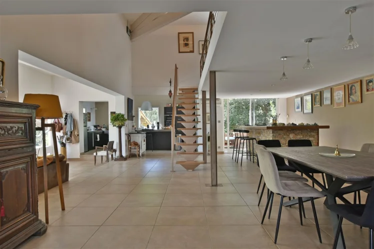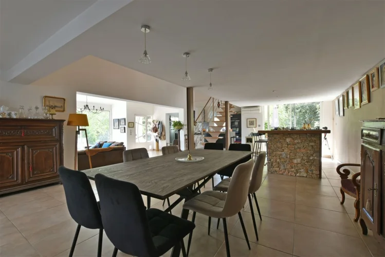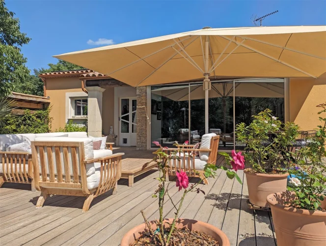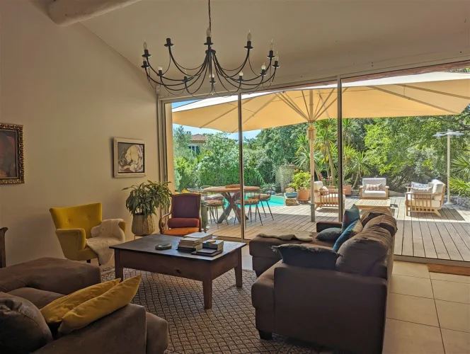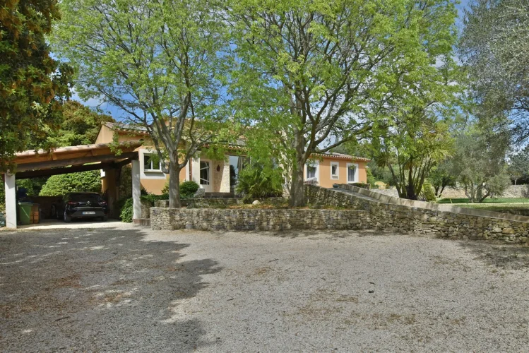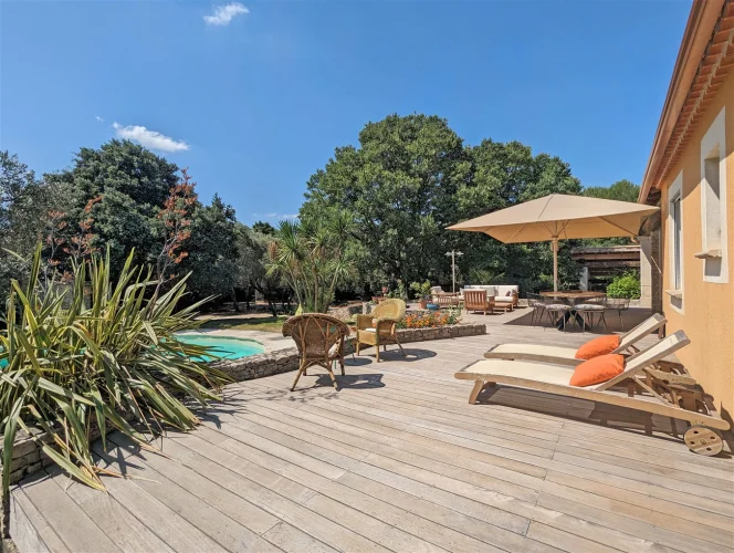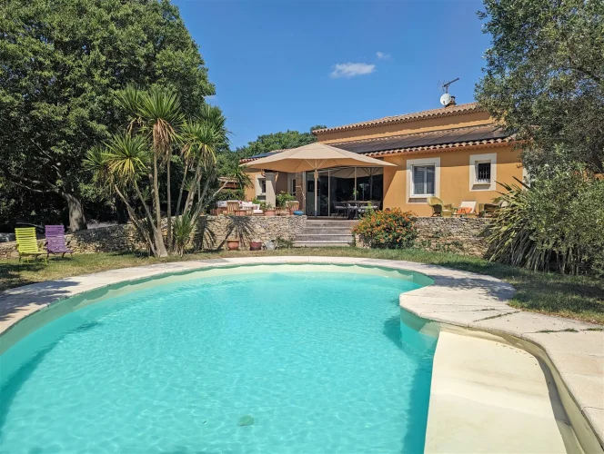 This wonderful villa is situated in the hills just outside Nimes, on a beautiful wooded plot of land with a swimming pool. The house is very spacious and well laid out with a large living room with a mezzanine gallery, a lounge opening onto the terrace and garden, and a semi-open fitted kitchen. In addition there are three bedrooms on the ground floor, each with a shower room, and one bedroom upstairs. There is a large wood terrace off the living room and a terrace off the kitchen. The swimming pool is delightfully sunny and has a paved sunbathing area. The property also has a very useful carport and separate 16m2 outbuilding with shower room and toilet.