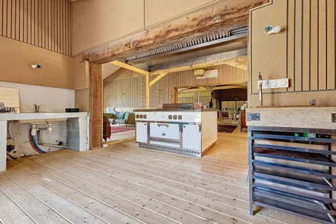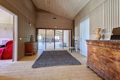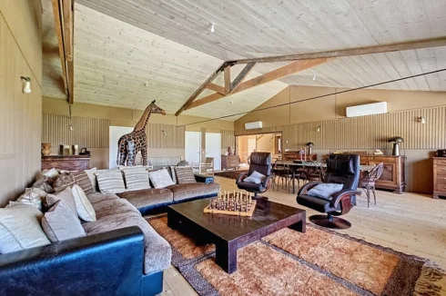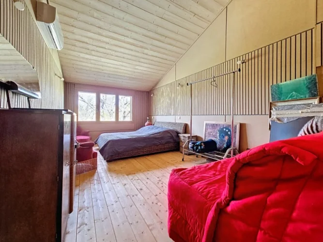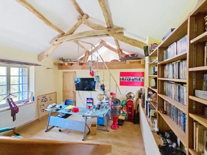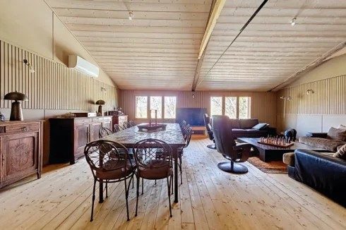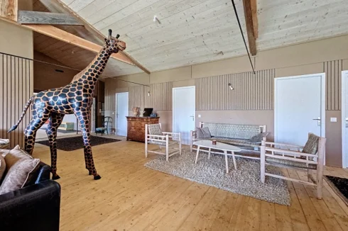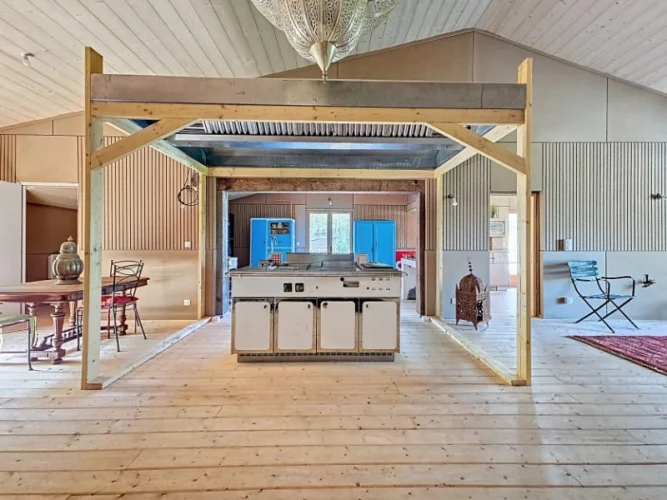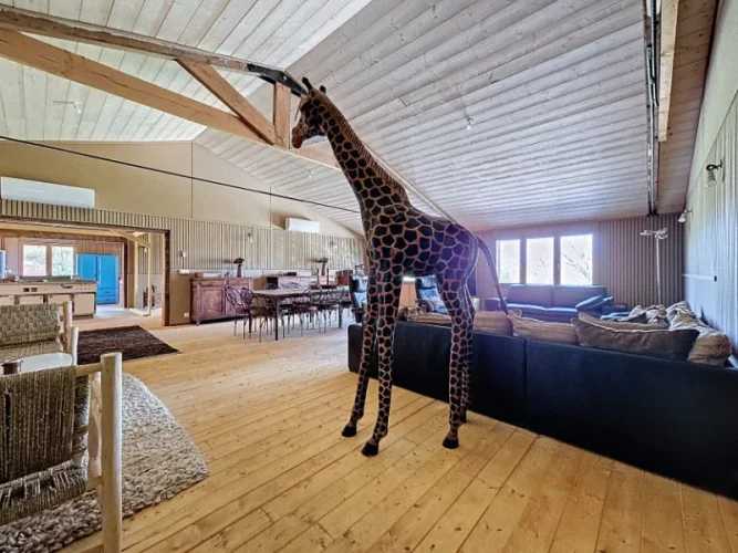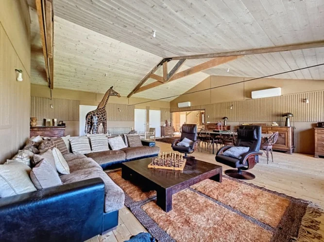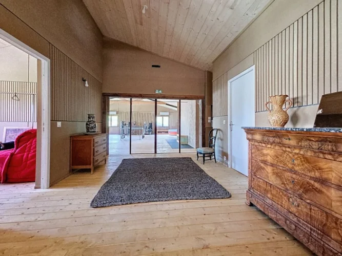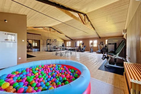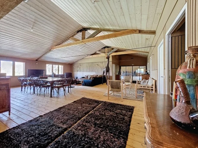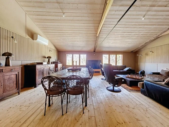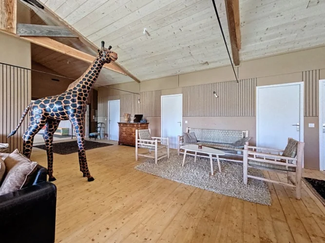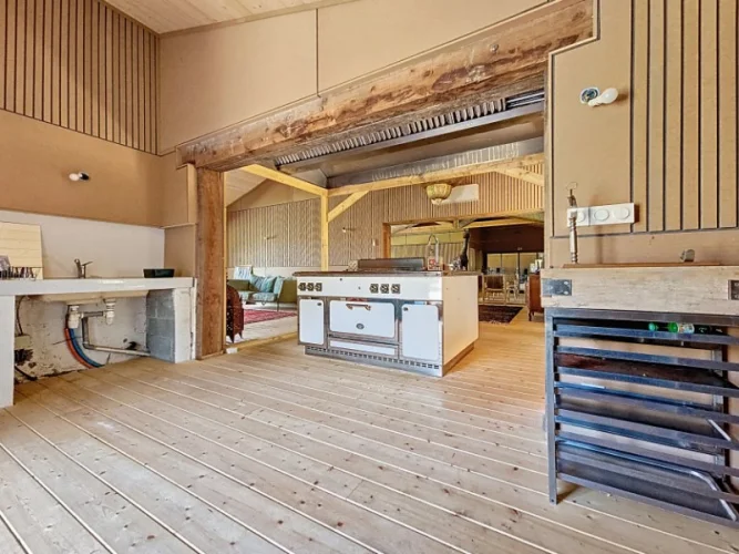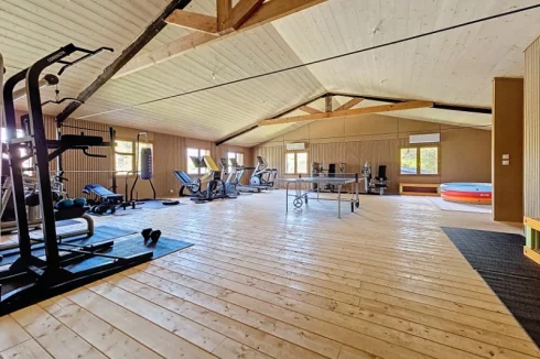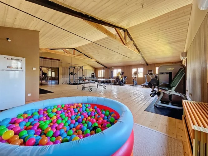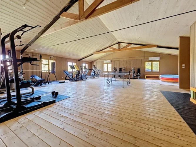 The gite has two very large garages and a workshop on the ground floor. The first floor features a spacious living room, a very large kitchen with a dining area, a huge games/gym, a dining room, four bedrooms, four shower rooms (to be finished: water supply and drainage have been completed, and the necessary parts are available), and a separate WC.