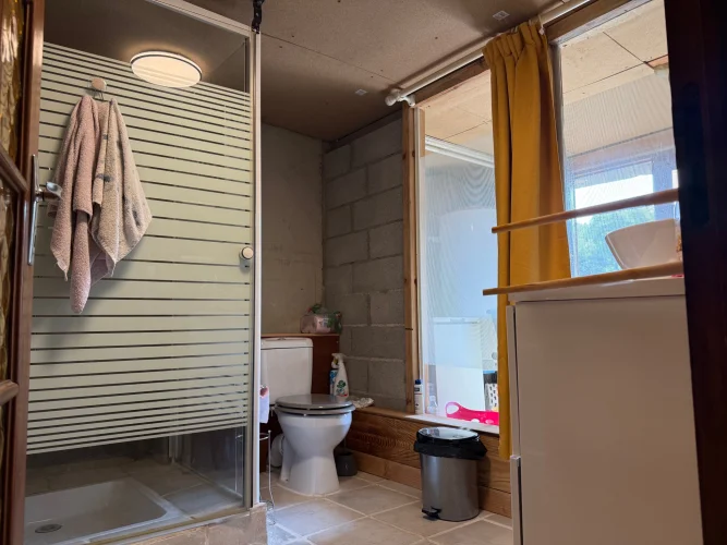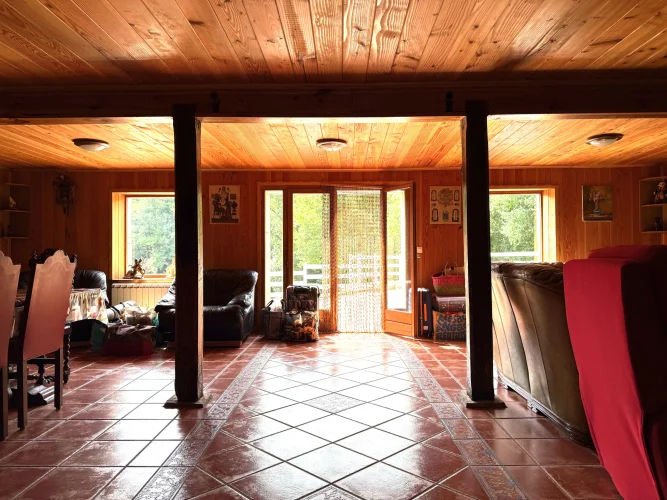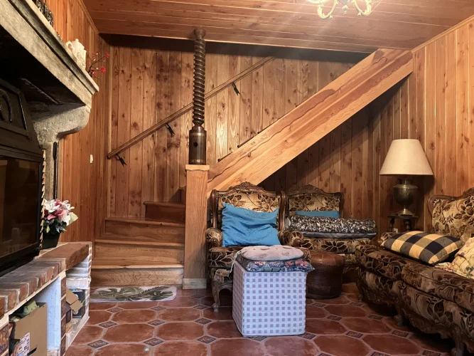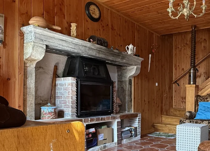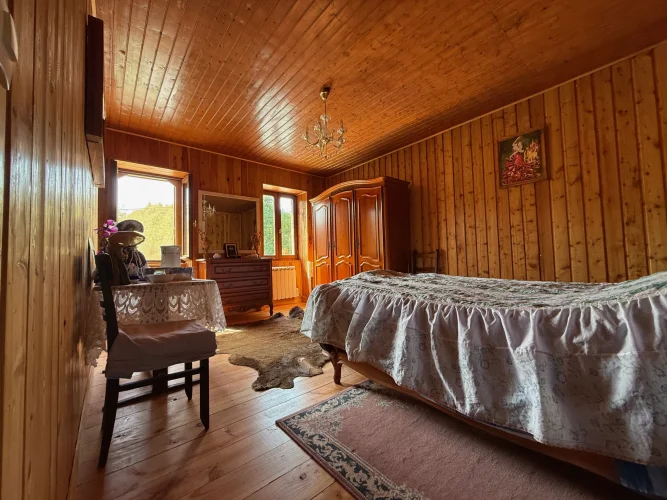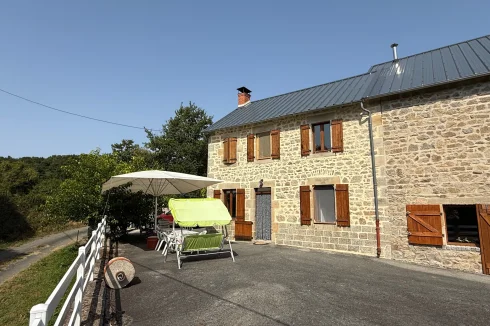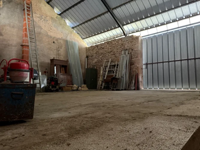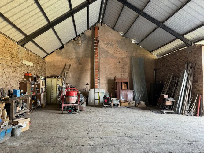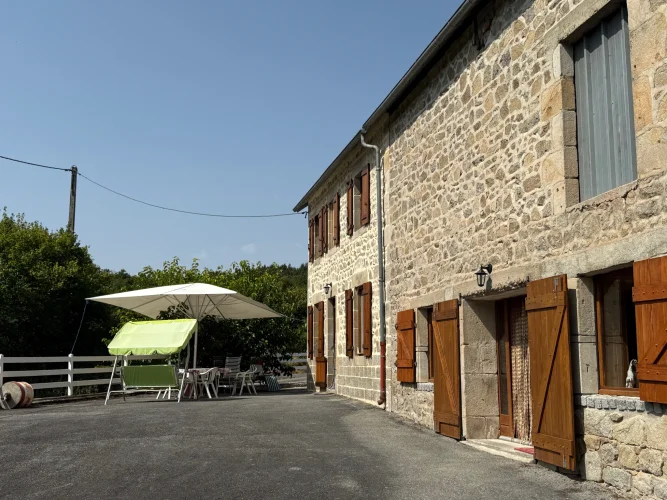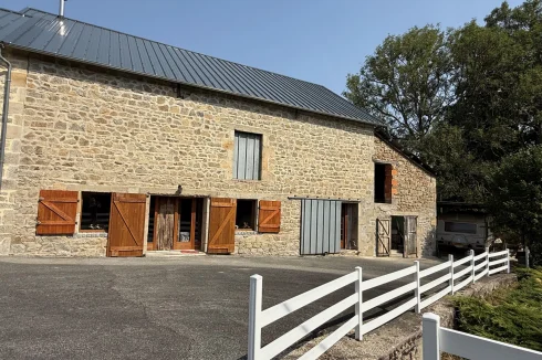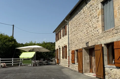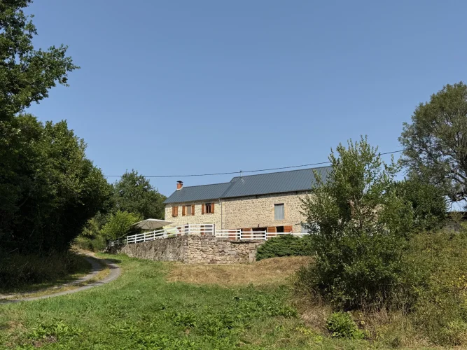 Auv 1191: Without neighbours: long farmhouse, total peace, 1.1 hectaresThis beautiful building used to be the dwelling house and barn of a former watermill located further down, which gives it a wonderful setting in the middle of nature, with the land running all the way down to a small river. The land surrounds the house completely and there are several fruit trees. There is also a long strip of deciduous woodland, where the water supply for the mill once ran, a branch of the river. The house is reached via a well-drivable dirt track and there are no direct neighbours. A large terrace overlooks the valley with stunning views.The habitable heated part of the house is currently 142m2, but the building obviously has much greater potential. The ground floor has a living room (18.5m2) with wood stove and authentic stone fireplace. Next to it is a kitchen/dining room (18.5m2) with wooden units. A part of the barn was integrated into the house and can be accessed from the kitchen or directly through the French doors onto the terrace. This space was converted into a spacious sitting and dining area of no less than 66m2. Also on this level there is a bathroom (5m2) with shower and a separate toilet (1.5m2). The entire ground floor has rustic tiled flooring. On the first floor of the original house there are two bright bedrooms (12m2 and 15.5m2) and a smaller room (6m2) with a nice pine floor. The staircase to the first floor is also pine and recent. The attic is insulated at floor level and currently not directly accessible, but it is very high and could be converted.On the right side of the barn a second bathroom (6m2) was created, not yet fully finished, as well as a multifunctional room (18m2), which could for example become an extra bedroom, or a second living space if rooms were added upstairs.At the back, at ground level, there is a large barn of 120m2 with a ridge height of 7m, a storage room (20m2) with WC and sink, and two open areas on the sides of the building of 16m2 and 40m2. Behind the house there is a spacious carport, and at the front a covered area is provided for parking a car. The house is heated by a combination of electric radiators and a wood stove.The water for the house is pumped from a deep well with pump house (5m2) next to the house and supplies running water all year round, even in dry periods. There is no mains water.The roof of the entire building was recently renewed after storm damage, with extremely strong steel sheets. The septic tank was once installed according to the standard, but is no longer compliant.The possibilities here are obviously very extensive, and it is rare to find a house with no neighbours.