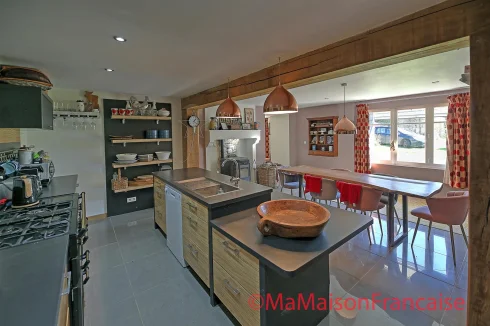 Entrance hall leads, on your left, to a large double aspect lounge with exposed stone walls and Charentaise fireplace with wood burning stove. To the right of the entrance hall is the fully fitted breakfast kitchen with tiled floor, Charentaise fireplace and pellet stove, window to the front and a good range of fitted units with an island with a breakfast bar. Office or hall with stairs upto first floor, window to the front and exposed stone wall. Laundry room and shower room.