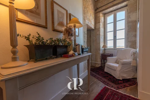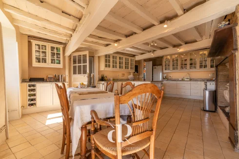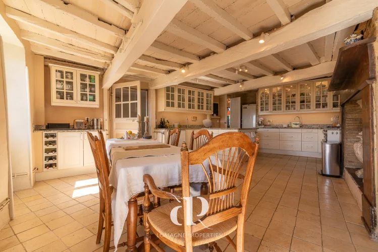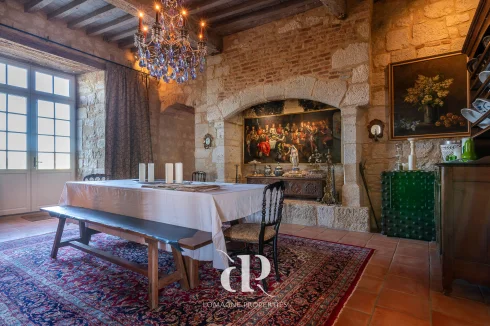 • Dining room (33m2) with original fireplace from 12th century, a second entrance door and access to the terrace with views.
