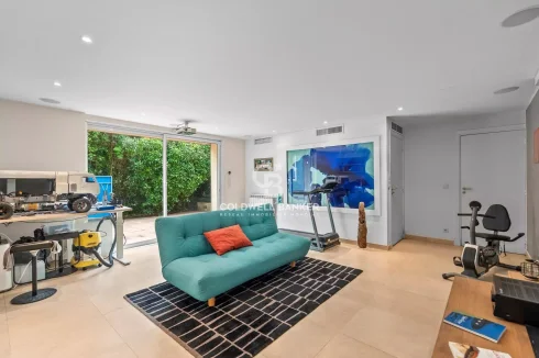 The spacious, light-filled living room opens onto a lovely outdoor area featuring a swimming pool and unobstructed views over the Mougins golf course.
