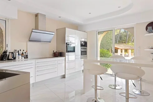 The villa is arranged over two levels. The upper level features a spacious and light-filled living area with a lounge, dining room and kitchen, all opening out onto the garden and the pool. This level also includes four bedrooms, offering comfort and privacy for family and guests. On the lower level, there is a second living room with a library, another kitchen, two additional bedrooms with two shower rooms, and a master suite complete with a large dressing room and bathroom. Also on this floor is an independent apartment with its own living room, kitchen, bedroom, shower room and dressing area, making it ideal for guests or extended family.