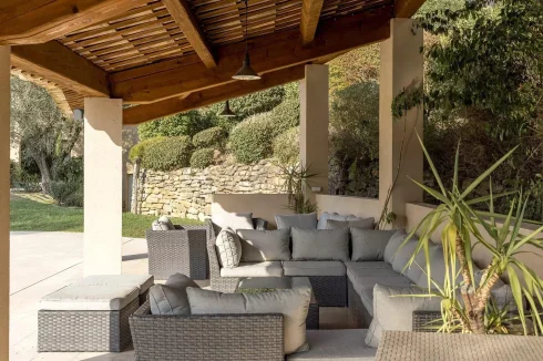 This remarkable property, set on over one hectare of land, is situated in a highly desirable residential area, ideally located between the charming villages of Mougins and Valbonne. It enjoys a lovely open view of the historic Château de Castellaras, providing a peaceful and picturesque backdrop.