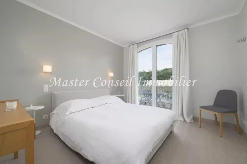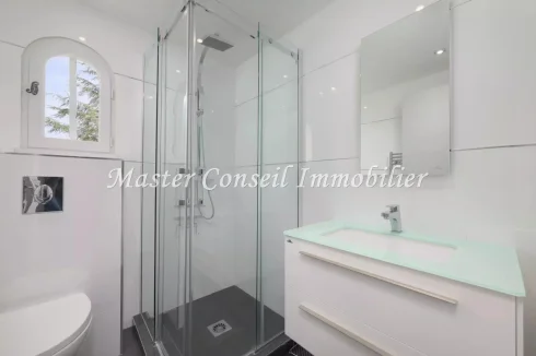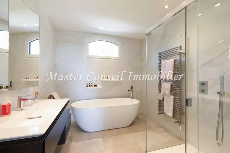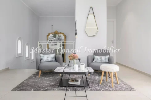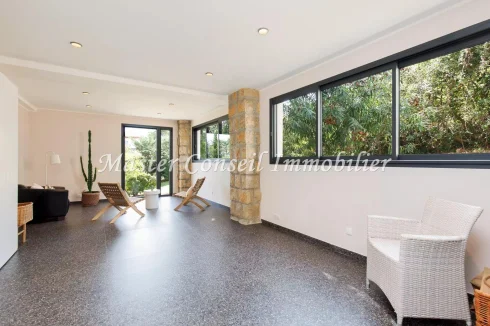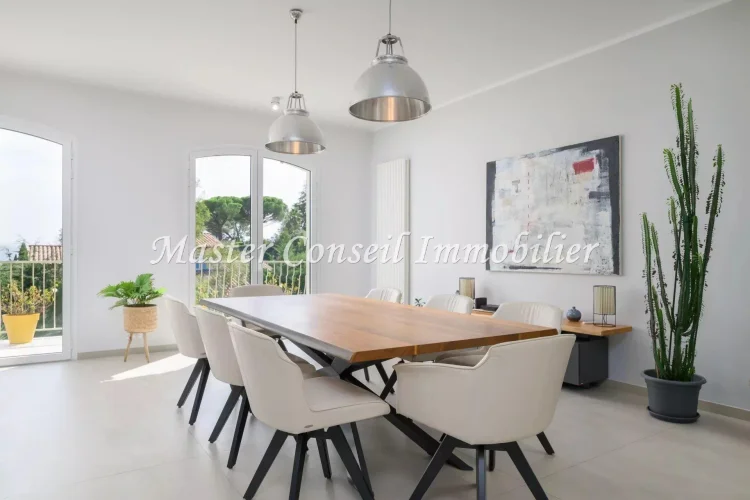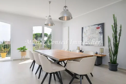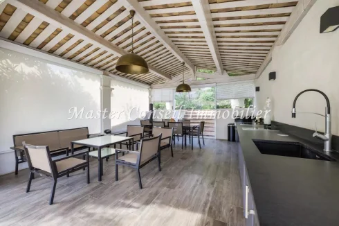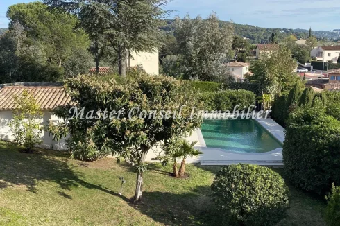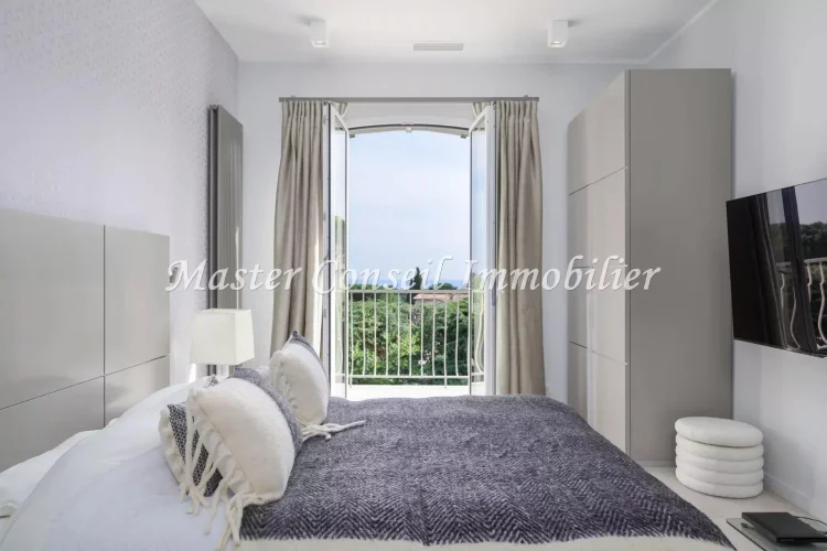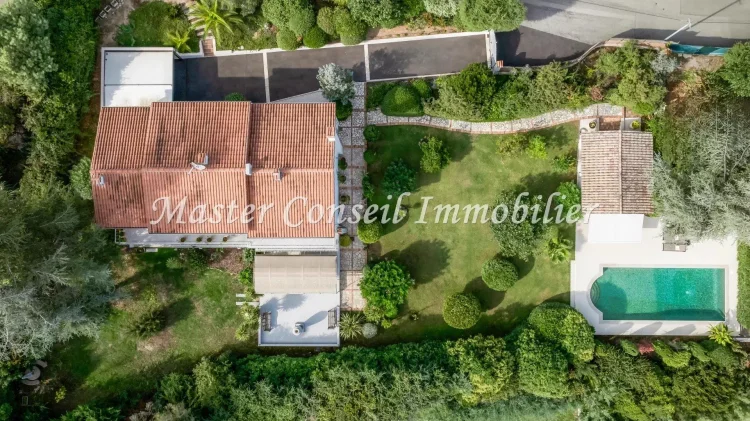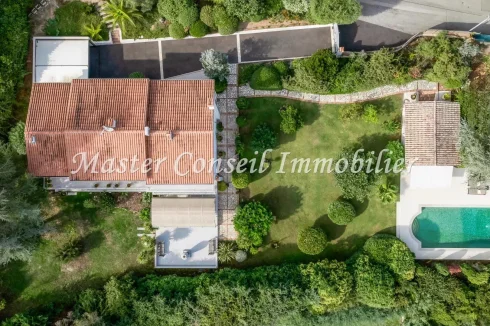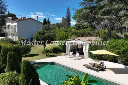 In a private and secure estate of 12 properties, this character villa, fully renovated with high-quality materials, benefits from a privileged location in an elevated position, just 15 minutes from Cannes and close to all amenities.