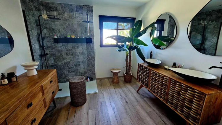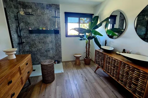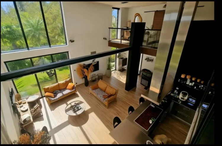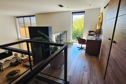 Upstairs, a large mezzanine leads to two office spaces, as well as four bedrooms, a dressing room, an elegant bathroom, and a separate toilet.