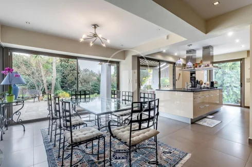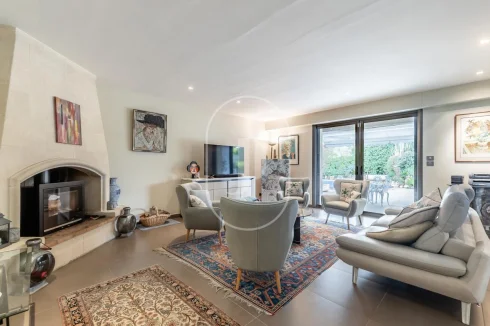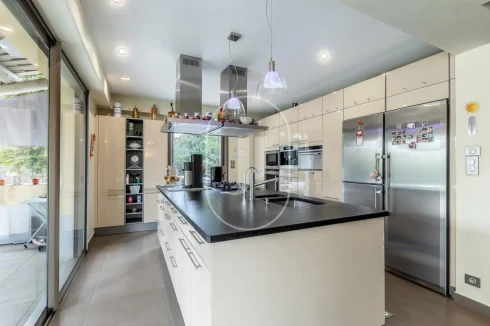 As soon as you cross the threshold, the harmony of the spaces is revealed in an intimate, soothing setting. The spacious 61 m² living room, bathed in light thanks to its large sliding glass doors, offers a fluid connection with the outside world. A cosy fireplace takes pride of place at the heart of the room, inviting you to enjoy precious moments of relaxation, while the elegant, open-plan kitchen is the perfect place for conviviality.