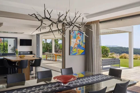 The villa’s expansive reception areas are bathed in natural light thanks to large bay windows, which open out onto spacious terraces and a spectacular fourteen by four-and-a-half metre mirror pool. This creates an idyllic setting for both relaxation and entertaining. Five beautifully appointed en-suite bedrooms, each with its own private bathroom or shower room, provide exceptional comfort and privacy for residents and guests alike.