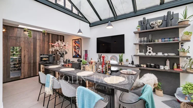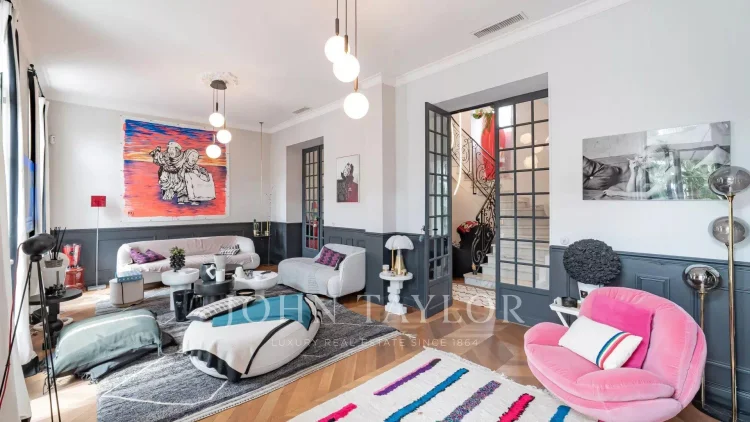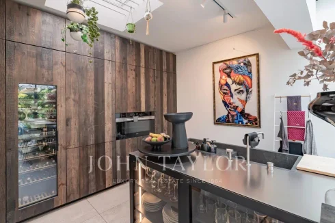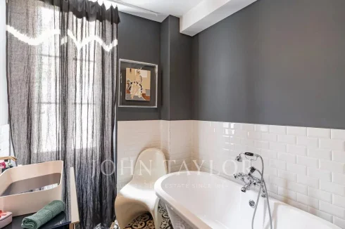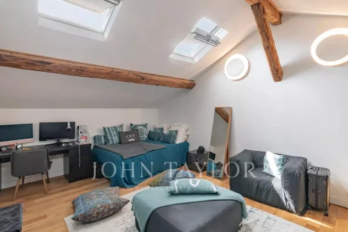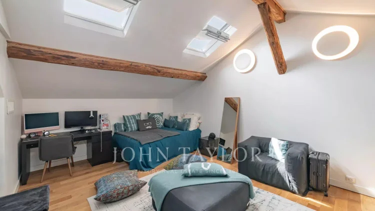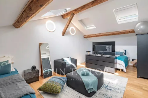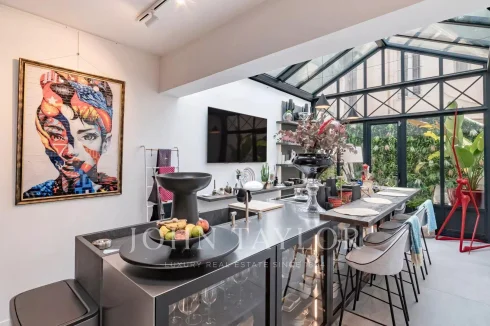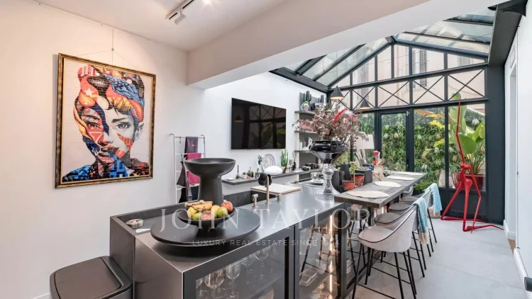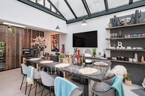 With a living space of 170 sqm, it consists of a large living / dining room open to the outside (3.10m high ceiling), a spacious fully fitted and equipped kitchen and a guest toilet.