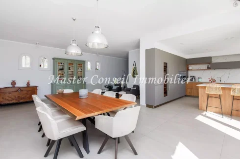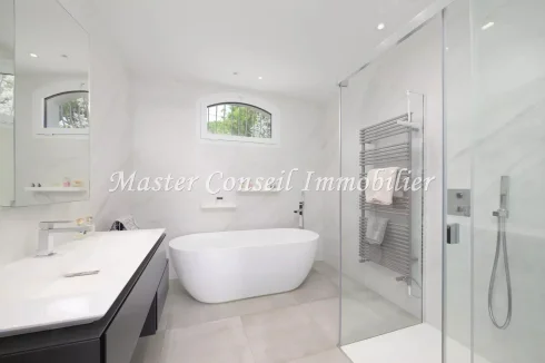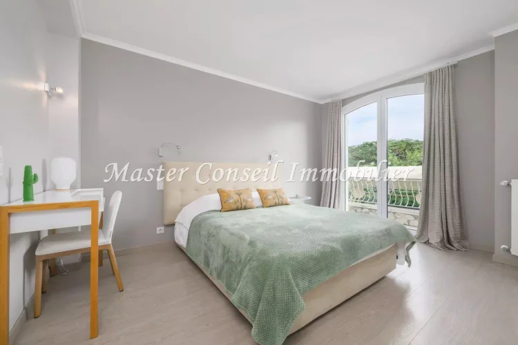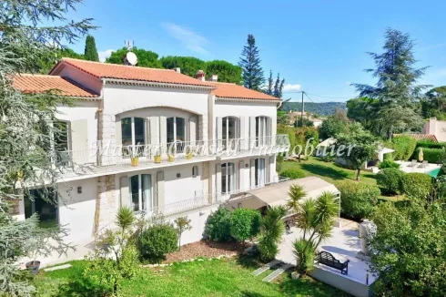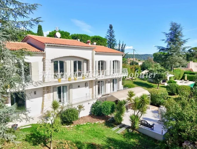 This contemporary 300 m² property (including pool house) offers an exceptional living environment, peaceful and quiet, just 15 minutes from Cannes and 30 minutes from Nice airport. Located in a private estate of 12 villas, it benefits from a secure and green setting, close to shops, international schools and beaches. Set on a flat, landscaped plot of 2,500 m², quiet and not overlooked. The fully renovated villa stands out for its generous volumes, brightness, and quality finishes. Outside, a superb mosaic-tiled swimming pool bordered by a large 110 m² sun deck faces an equipped pool house: summer kitchen, lounge, dining area opening onto a magnificent landscaped garden.The villa:The garden level includes 4 bedrooms, 3 bathrooms/shower rooms, a laundry room and ample storage.
