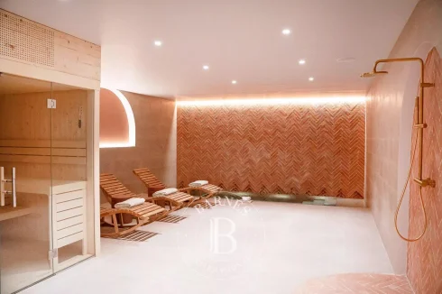 The basement features an en suite bedroom, a gym and a large wellness area with sauna and heated pool.