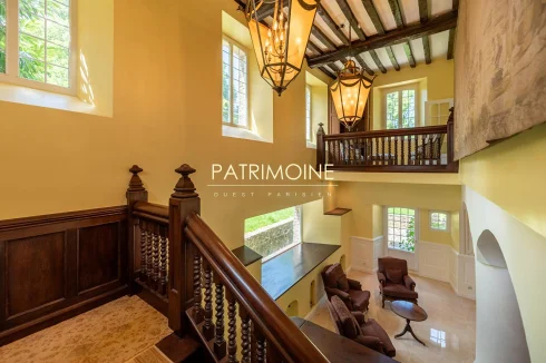 A masterful period wooden staircase that overlooks a triple reception room opening onto a terrace. The reception includes three exhibitions, with high ceilings and a fireplace.