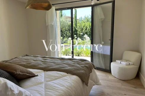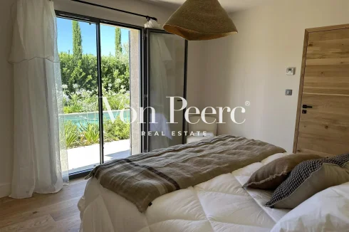 Upstairs, there is another beautiful en-suite bedroom, as well as 2 additional bedrooms and a bathroom. The outdoor spaces include a beautifully landscaped garden with local plants, a 10x4 heated swimming pool (with a rolling cover), a wooden terrace, a large porch for outdoor dining, a pétanque court, and a lovely stone fountain.