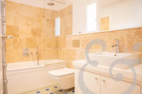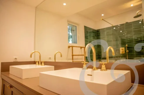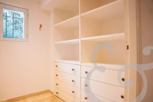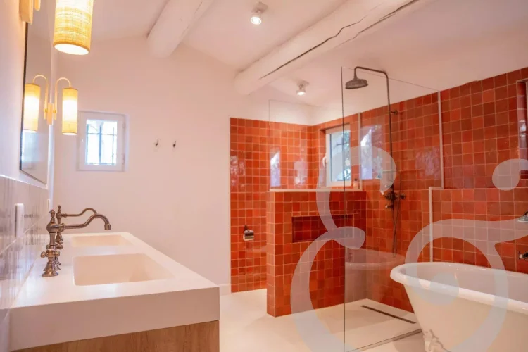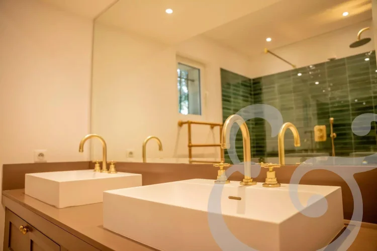 Upstairs, two en-suite bedrooms, one with a shower room/WC and walk-in closet, and the other with a shower room/WC/bathtub and walk-in closet, complete this welcoming and refined living space. Outside, the landscaped garden of over 3,600 m² offers an enchanting setting, planted with olive and pine trees and Mediterranean species, punctuated by shaded terraces, the heated and secure swimming pool (12m x 5m), and its fully equipped pool house for your summer evenings.