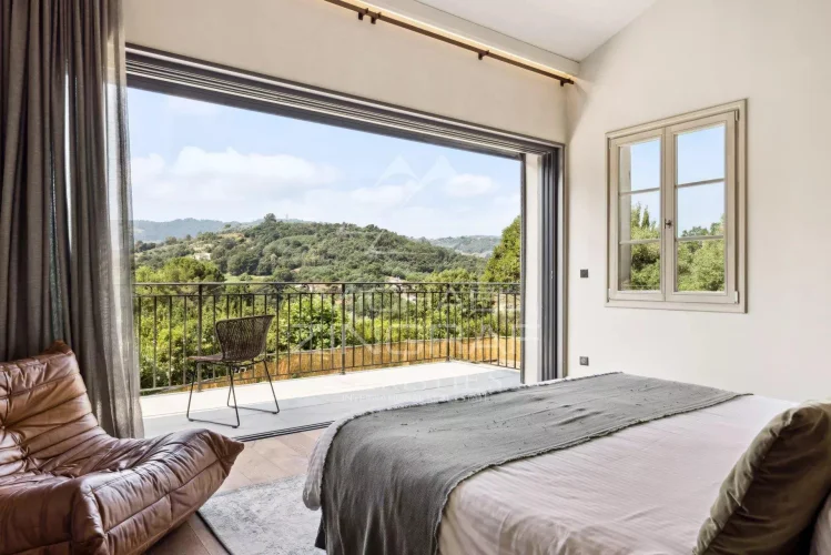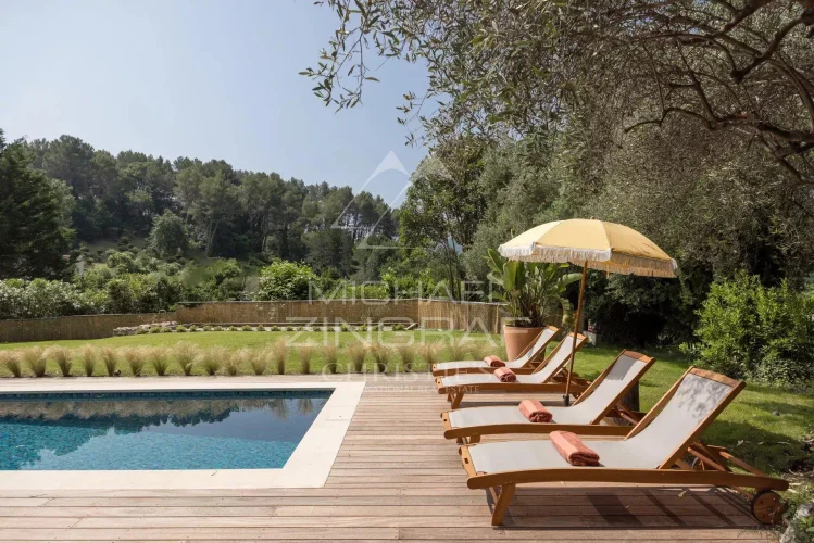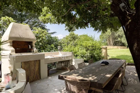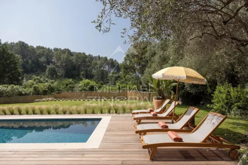Nestled in a peaceful setting just 10 minutes from Cannes and Mougins, this beautifully renovated bastide with a contemporary spirit sits on a plot of approximately 2,300 m², adorned with majestic trees providing ideal natural shade during the summer months.