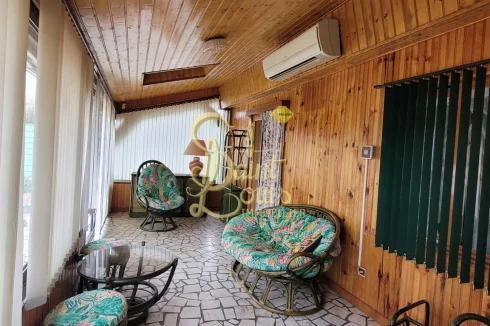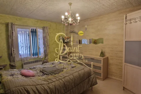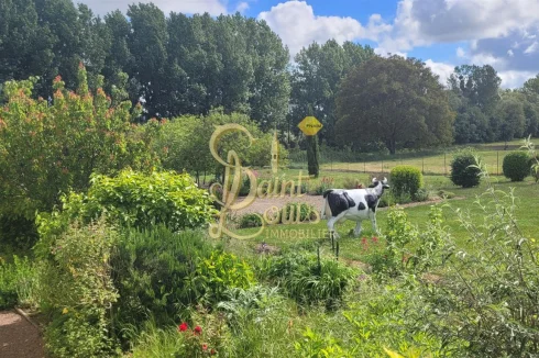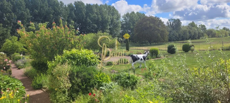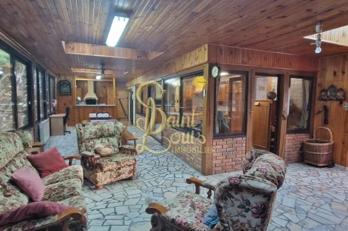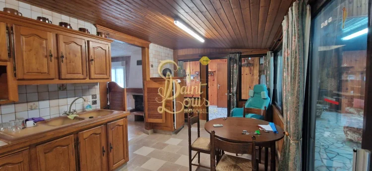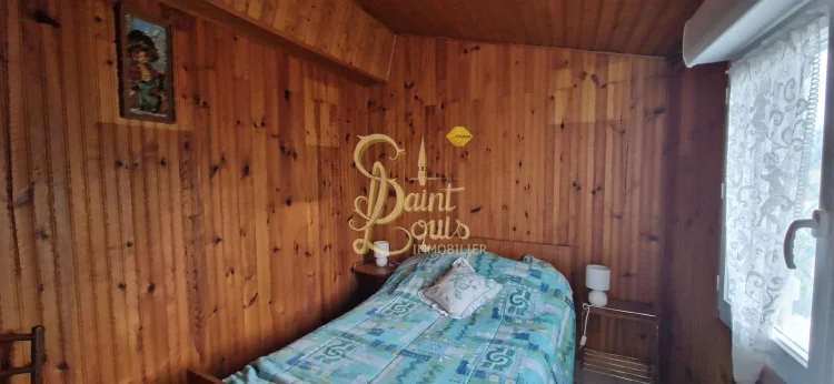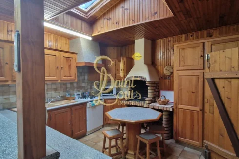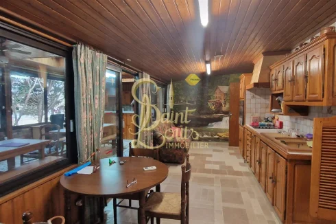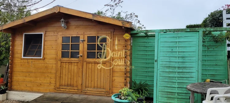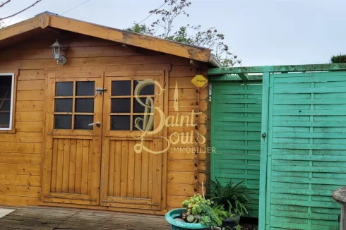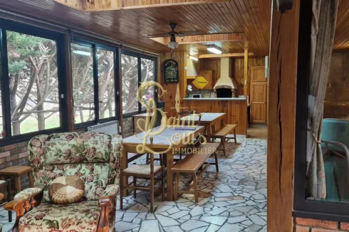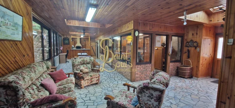 Outside, a large garage with mezzanine for storage and a small wooden chalet in the garden area, all on an enclosed and wooded plot of 2610 m2