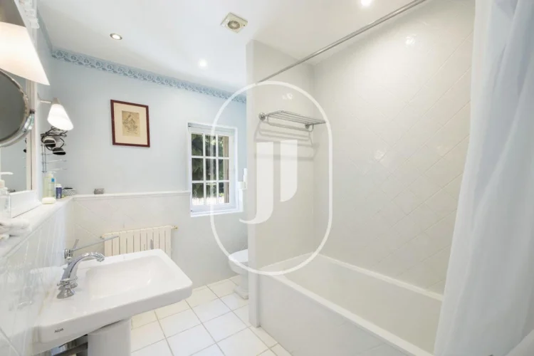 Upstairs, there are three bedrooms, one of which is en suite with a shower room, Wc, and sink. Another bathroom completes this floor, with a bathtub, sink, and Wc. The bedrooms on this level are equipped with air conditioning, a valuable feature.