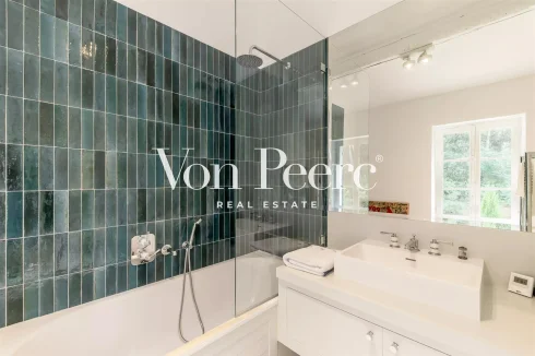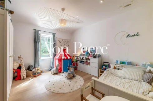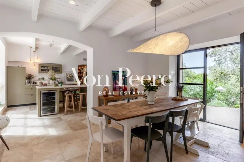 The outdoor space is a true summer haven, with a large swimming pool, a sun-soaked terrace, and a spacious pool house—perfect for relaxing outdoor moments. Additionally, a large enclosed garage provides secure storage space for vehicles.