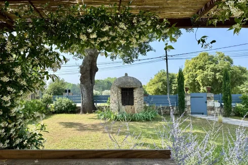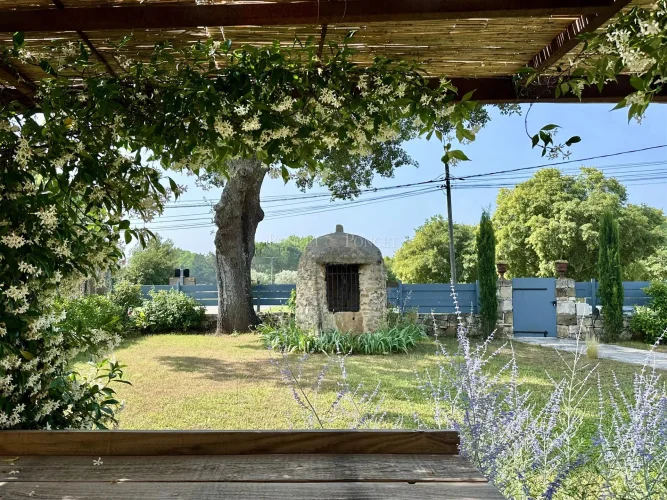 This authentic stone mas, beautifully renovated, is ideally set on a 1,705 m² fully enclosed and landscaped plot, surrounded by Mediterranean plants, manicured lawns, flowering beds, and an old stone well. A serene and private atmosphere greets you at the entrance, accessed via a charming pedestrian pathway lined with lush greenery.