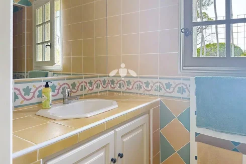 for. The villa has three spacious bedrooms on the ground floor, including the master suite. The latter is located in a separate wing, with a bathroom, dressing room, and kitchenette. All bedrooms on the ground floor have French doors opening onto the terrace. The ground floor also includes a bathroom, separate toilet, study, spacious utility room and golf storage room. Upstairs, you will find two more double bedrooms, each with an en-suite bathroom.