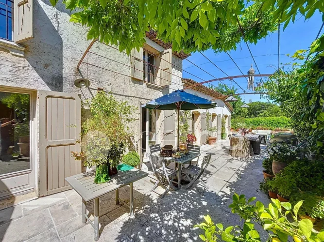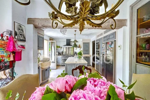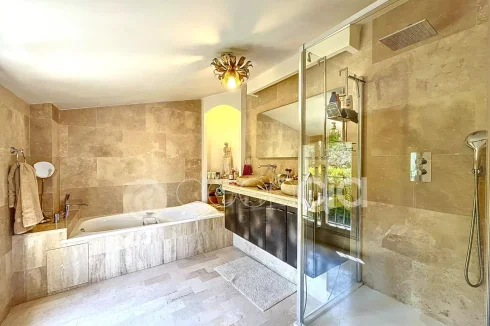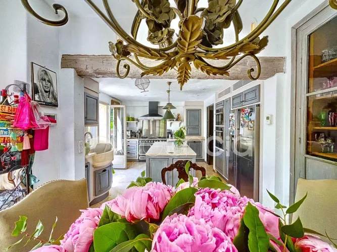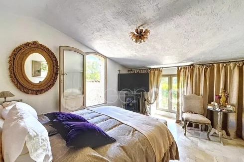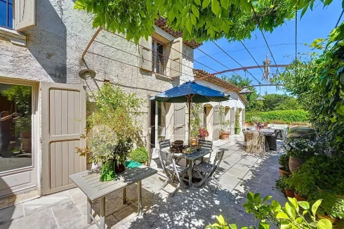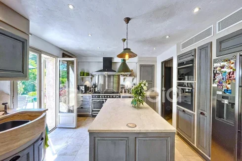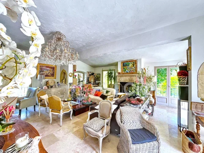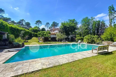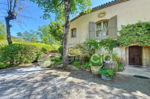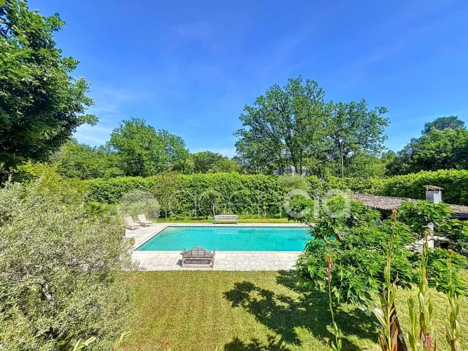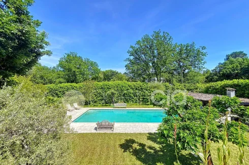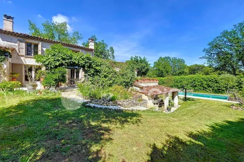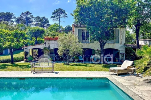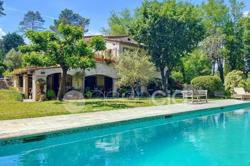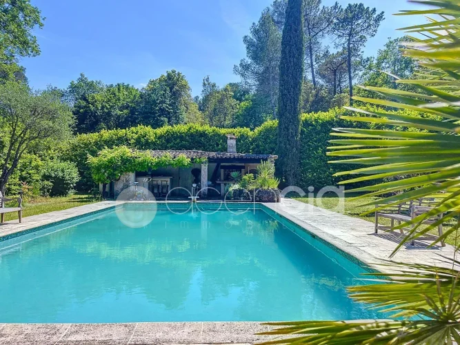 Valbonne, close to the center: Estate with a large 6900 m2 plot and a Charming 300 m2 Villa with 7 rooms including 5 bedrooms, 60 m2 additional annexes, and a Swimming Pool, located just a few minutes from the village center and the Golf course. The Villa is set in an Absolutely Quiet environment with 360° exposure, on a flat, harmonious plot of land planted with trees. Two private Tropézien-style terraces adjoin the bedrooms. The vast Garden features a large 17x6 traditional Swimming Pool and a Poolhouse with summer kitchen.