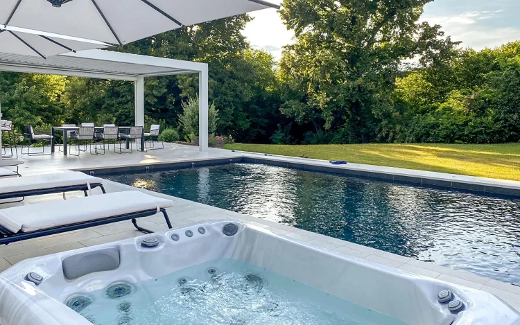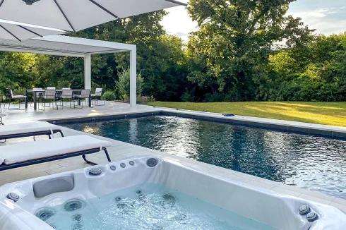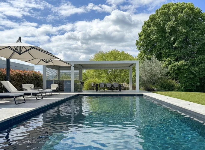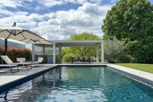 A relaxation area awaits you below, with swimming pool, jacuzzi, summer kitchen... In the shade of the parasols and the white bioclimatic pergola.