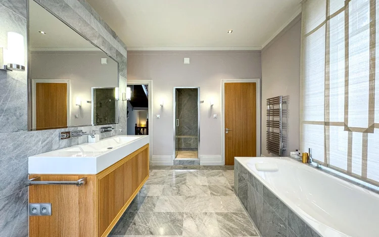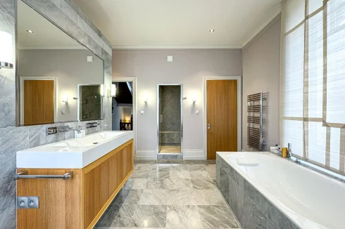 The same goes for the kitchen, the latest technology, subdued lighting, Miele appliances. An office/library and a shower room (Wc) complete this ground floor.