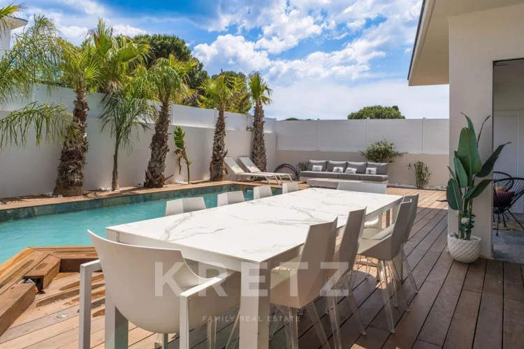 Grau d'Agde - Exclusivity. Close to beach, port and town centre. In a private and secure area. Contemporary villa of approximately 160 m2 with swimming pool and pool-house. Cathedral living room of 65 m2, American kitchen open to the pool-house, back kitchen. A superb master suite suite with shower room and dressing room. The upper level offers two beautiful bedrooms with shower rooms. High-end services. Reversible air conditioning ducted. Garage. A stone's throw from the beach, shops and schools.