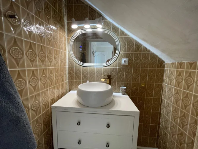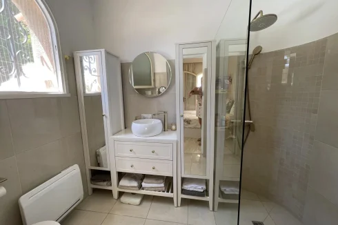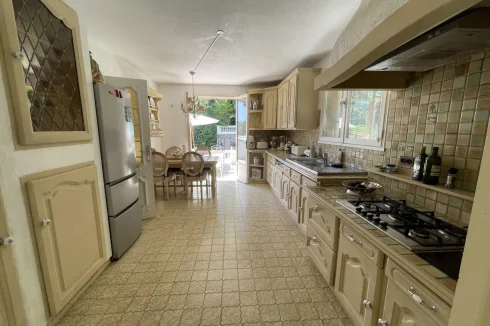 Entrance hall, living room and lounge with fireplace opening onto the south-facing terrace, fitted kitchen connecting to the swimming pool, north-facing terrace with barbecue, one bedroom and en-suite bathroom with toilet on the main level.