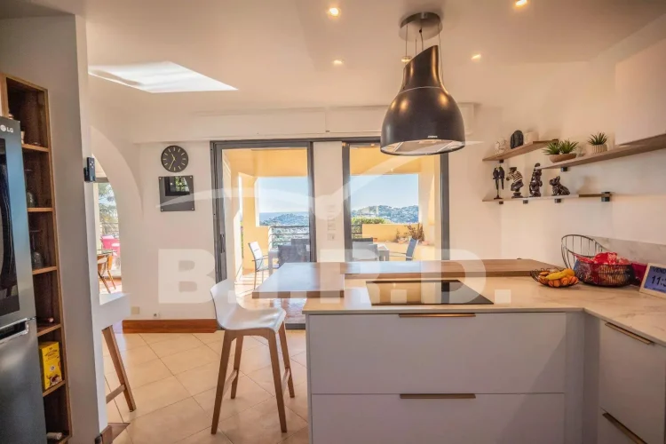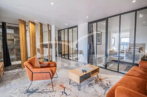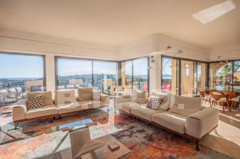 It benefits from a double sea view and has a living area of 249 m² and is composed of a spacious and bright living room with large bay windows, a fully equipped open kitchen, and 4 bedrooms en suite. Outside you will enjoy the large terraces and the magnificent heated infinity pool.