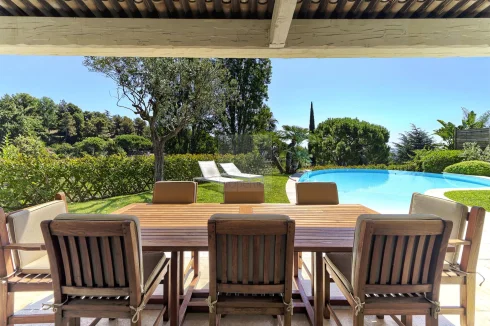 Very beautiful 130m2 villa located in the Hauts de Vaugrenier, at the end of a dead end and benefiting from absolute calm. Semi-Detached villa by the garage. This beautiful villa is composed on the ground floor of an entrance hall opening onto a large living and dining room overlooking the garden. A fully equipped semi-open kitchen, two bedrooms, a shower room and dressing room. Upstairs, two bedrooms, a dressing room and a bathroom with toilet. A garage is attached to the villa, a laundry area of approximately 20m2. A beautiful covered terrace provides additional outdoor living space with a beachfront pool. The garden extends in a circular pattern around the house. This perfectly maintained villa is ready to move into. Gated residence, secure 24/7.