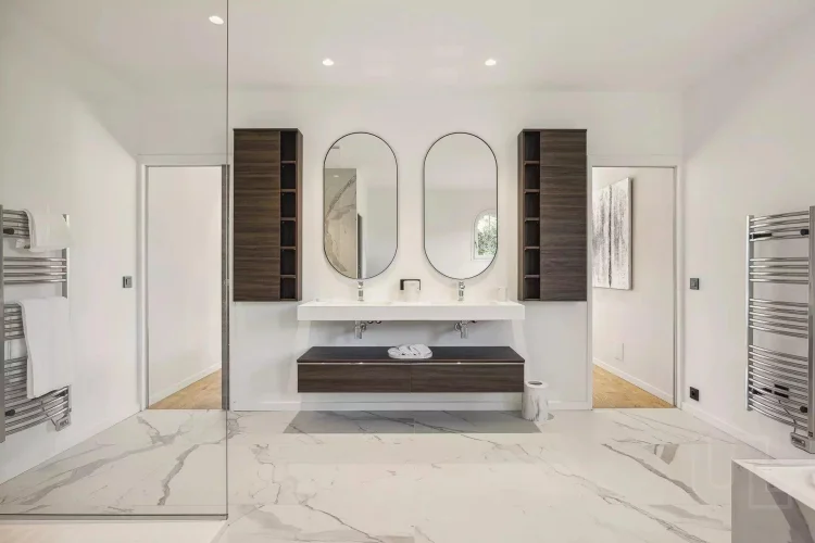 On the mezzanine level, a quiet study area complements a charming guest suite with its own shower room. The garden level provides two additional large suites, perfect for family or guests, along with ample storage space.